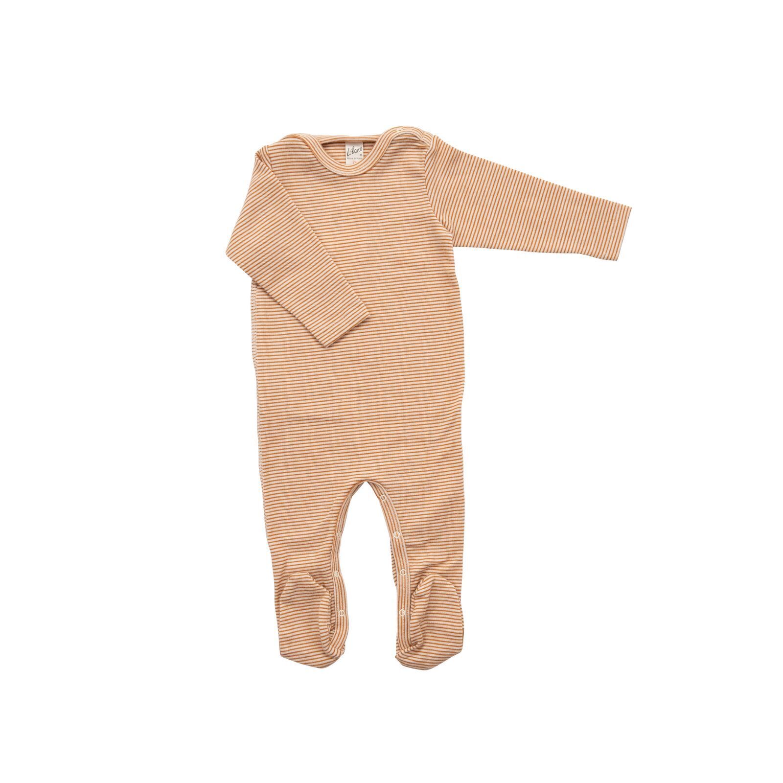 Der geringelte Overall mit Fuß von Lilano besteht aus einem beliebten Wolle-Seide-Gemisch. Durch das Schmirgeln der Oberfläche entsteht eine besonders kuschelige Haptik. Dieses Modell ist seit vielen Jahren ein Bestseller und besonders für Neugeborene geeignet, da es eine wärmende Hülle bietet. Der Overall ist leicht an- und auszuziehen dank der Druckknöpfe auf den Schultern und im Schrittbereich. Er besteht aus 70% Merinoschurwolle (kbT) und 30% Seide, was ihn besonders weich macht. Der Strampler hat Füße, damit die Kleinsten gut eingepackt sind. Super auch als Schlafanzug.