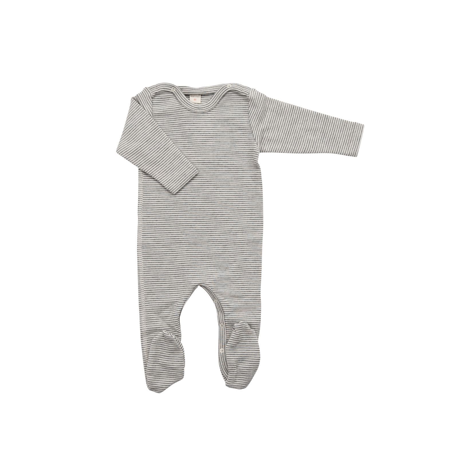 Der geringelte Overall mit Fuß von Lilano besteht aus einem beliebten Wolle-Seide-Gemisch. Durch das Schmirgeln der Oberfläche entsteht eine besonders kuschelige Haptik. Dieses Modell ist seit vielen Jahren ein Bestseller und besonders für Neugeborene geeignet, da es eine wärmende Hülle bietet. Der Overall ist leicht an- und auszuziehen dank der Druckknöpfe auf den Schultern und im Schrittbereich. Er besteht aus 70% Merinoschurwolle (kbT) und 30% Seide, was ihn besonders weich macht. Der Strampler hat Füße, damit die Kleinsten gut eingepackt sind. Super auch als Schlafanzug.