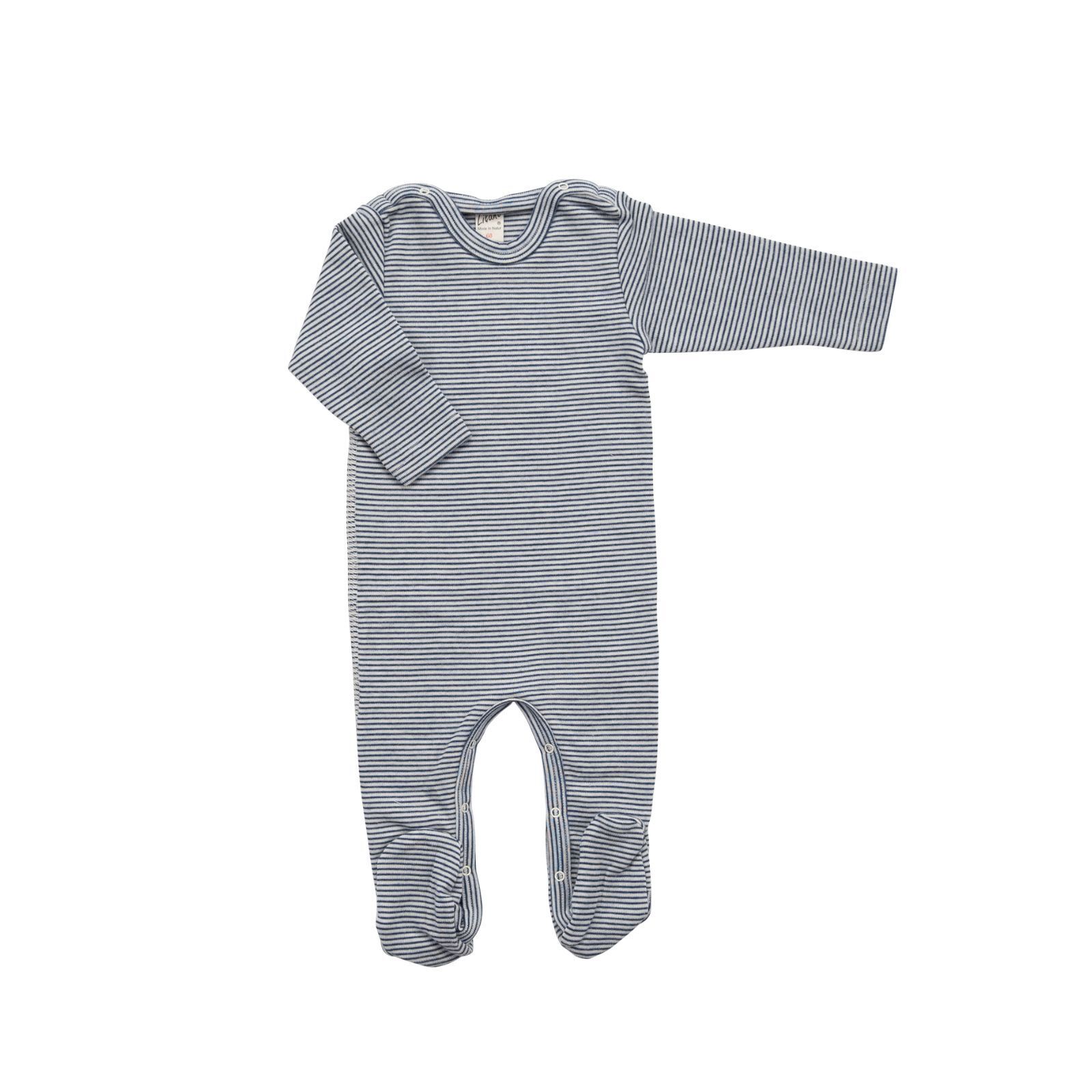 Der geringelte Overall mit Fuß von Lilano besteht aus einem beliebten Wolle-Seide-Gemisch. Durch das Schmirgeln der Oberfläche entsteht eine besonders kuschelige Haptik. Dieses Modell ist seit vielen Jahren ein Bestseller und besonders für Neugeborene geeignet, da es eine wärmende Hülle bietet. Der Overall ist leicht an- und auszuziehen dank der Druckknöpfe auf den Schultern und im Schrittbereich. Er besteht aus 70% Merinoschurwolle (kbT) und 30% Seide, was ihn besonders weich macht. Der Strampler hat Füße, damit die Kleinsten gut eingepackt sind. Super auch als Schlafanzug.
