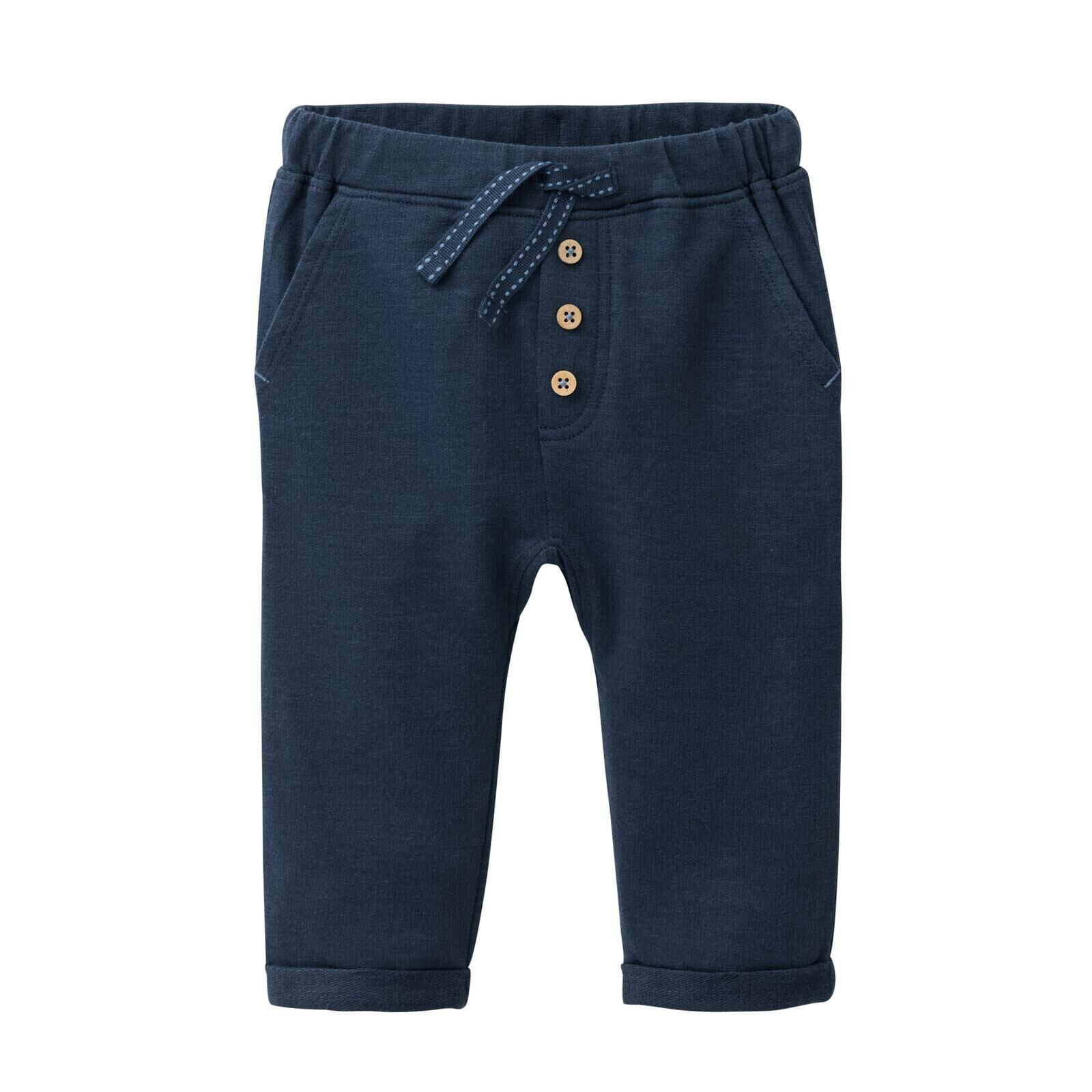 Diese dunkelblaue Sweat-Hose ist ein echtes Multitalent: weicher Slub-Sweat, praktische Taschen und liebevoll gestaltete Kokosknöpfe machen sie zum perfekten Begleiter für das ganze Jahr.