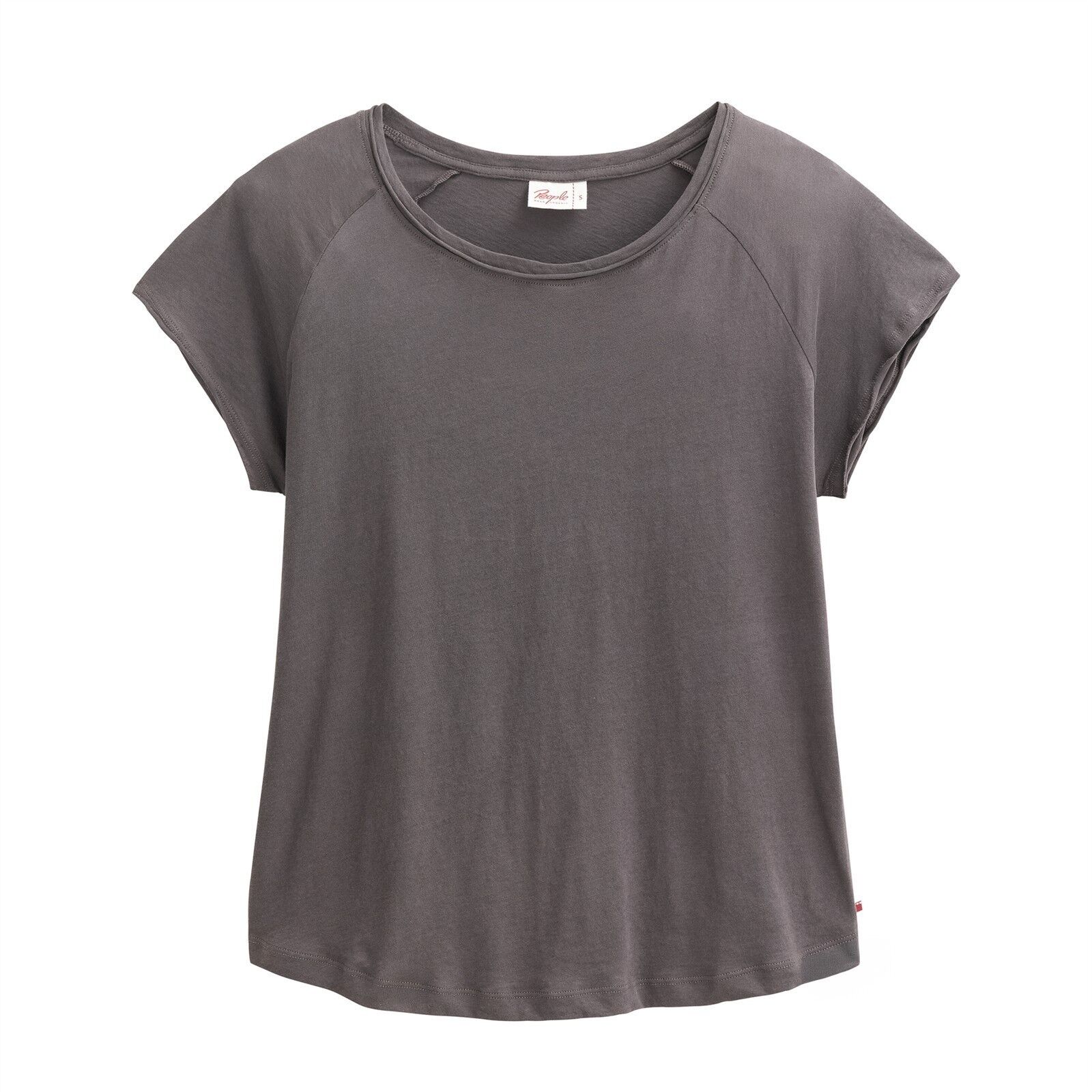 Kombinierfreudiges graubraun - sehr viel schöner als der Farbname vermuten lässt :D. Uni, klar geschnitten, mit lässigen Raglanärmeln. Regulär und gerade im Schnitt, normale Länge – nicht übertrieben, nichts kompliziert. Die feine, leichte Bio Baumwolle fühlt sich angenehm luftig an. Im Sommer locker getragen, an kühleren Tagen unter Interlockjacke oder Strickweste.